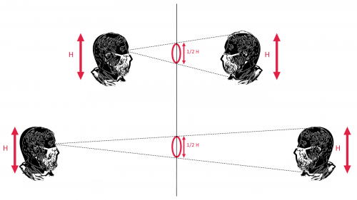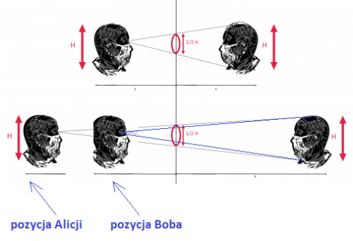 Bardzo fajne zadanie. Tylko szkoda, że nie było napisane, że Bob obrysowuje twarz, jaką widzi Alicja, albo, że Alicja obrysowuje swoją twarz 2-metrowym pędzlem. Bob stojący przy lustrze widzi jednak twarz Alicji znacznie mniejszą niż swoją własną.