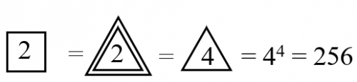 Zad. 2. W notacji wielokątowej Steinhausa dla liczby całkowitej dodatniej n zapis n w trójkącie oznacza n↑n. Z kolei n w kwadracie oznacza n w n trójkątach, a n w pięciokącie oznacza n w n kwadratach itd. W zapisie wielokątowym działania wykonujemy od wewnątrz, np.