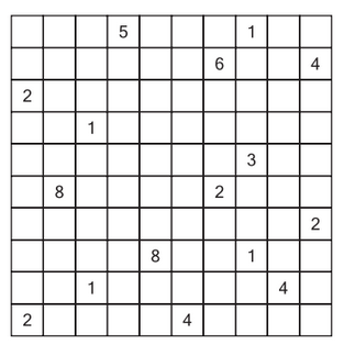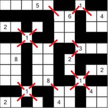 Zad. 3. Ustal położenie prostokątnych tratw na wodnym akwenie, zamalowując niektóre pola. Tratwa jest to biały prostokąt zawierający jedno pole z liczbą albo nie zawierający żadnego pola z liczbą. Tratwa zawierająca liczbę musi mieć tyle kwadratowych pól, ile wynosi ta liczba (włącznie z polem z liczbą). Kratki przylegające bokiem do tratwy muszą być zamalowane (zalane wodą), tzn. że tratwy nie mogą mieć wspólnych boków, ale każda tratwa musi być połączona rogiem z jakąś inną. Każde pole z liczbą musi być częścią jakiejś tratwy, a wszystkie tratwy muszą tworzyć całość połączoną rogami. Pola zamalowane (zalane wodą) nie mogą zawierać kwadratu 2×2. W rozwiązaniu prześlij ciągi liter opisujące I, III, V, VII i ostatni wiersz diagramu. W tym ciągu litera T oznacza kratkę należącą do tratwy, a W - kratkę z wodą.
