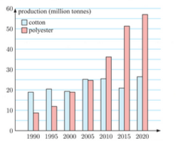 - Poniższy diagram przedstawia światową produkcję bawełny i poliestru (w milionach ton) w ostatnim trzydziestoleciu.