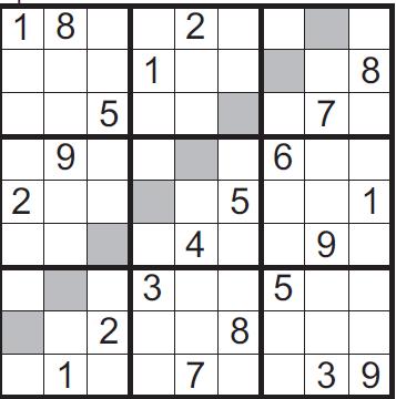 Zad. 2. Rozwiąż sudoku. Oprócz klasycznych reguł obowiązuje w nim warunek, że w polach zacienionych mają stać cyfry parzyste. Rozwiązanie podaj kolejnymi wierszami.