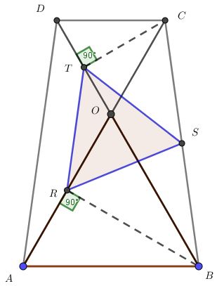 Zad. 3. Trapez spełniający warunki zadania jest równoramienny (dlaczego?). Niech R, S, T będą środkami odcinków odpowiednio OA, BC, OD i niech |AD|=|BC|=c. Odcinek RT łączy środki boków trójkąta AOD, więc |RT| = c/2. Trójkąt BCT jest prostokątny (dlaczego?), więc punkt S (jako środek przeciwprostokątnej) jest środkiem okręgu opisanego na tym trójkącie. Stąd |TS| = |CS| = |BS| = c/2. Podobnie uzasadniamy, że |SR| = c/2. Zatem trójkąt RST jest rzeczywiście równoboczny.