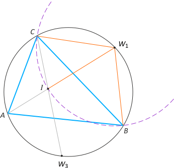 Zad. 1. Zauważmy, że środki łuków są punktami przecięcia okręgu z dwusiecznymi kątów trójkąta. Szukanym punktem wspólnym okręgów jest środek I okręgu wpisanego w trójkąt ABC, bowiem z zasady trójliścia (patrz luty 2014, zad. 3) mamy |W1I| = |W1C| = |W1B|. Analogicznie |W2I| = |W2C| = |W2A| oraz |W3I| = |W3A| = |W3B|.