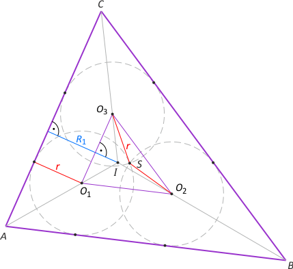 Zad. 2. Niech S będzie punktem wspólnym okręgów o środkach O1, O2 i O3. Wówczas promień tych okręgów r = |SO1| = |SO2| = |SO3| jest jednocześnie promieniem okręgu opisanego na trójkącie O1O2O3. Łatwo zauważyć, że środki okręgów wpisanych w trójkąty ABC i O1O2O3 pokrywają się, a ponadto boki tych trójkątów są w odpowiednich parach równoległe i oddalone o r. Oznacza to podobieństwo tych trójkątów, a z niego otrzymujemy proporcję R1:R = (R1–r):r. Ostatecznie R1 = Rr/(R–r).