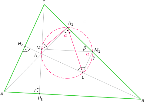Zad. 3. Niech K, L i M będą odpowiednio środkami wysokości AH1, BH2 i CH3 w trójkącie ostrokątnym ABC. Znajdź sumę miar kątów LH1M, MH2K i KH3L.