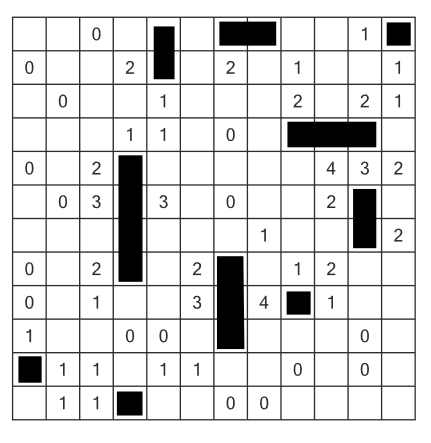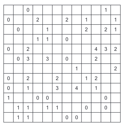 Zad. 1. Poniższy diagram przedstawia planszę łamigłówki "Statki". Na pustych polach należy rozmieścić cztery jednomasztowce, trzy dwumasztowce, dwa trzymasztowce i jeden czteromasztowiec (n-masztowiec zajmuje n kolejnych kratek w pionie lub poziomie stykających się bokami). Cyfry oznaczają, na ilu sąsiednich polach (stykających się bokiem lub rogiem z polem z cyfrą) znajdują się pola z okrętami. Okręty nie mogą się stykać ani bokiem, ani rogiem. Rozmieść statki na planszy. W rozwiązaniu prześlij skan lub zdjęcie otrzymanego rysunku.
