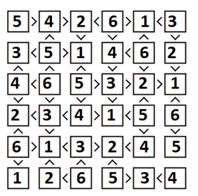 Zad. 3. Rozwiąż puste sudoku-nierówności. W rozwiązaniu podaj kolejnymi wierszami zawartość wewnętrznego kwadratu 4×4.