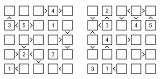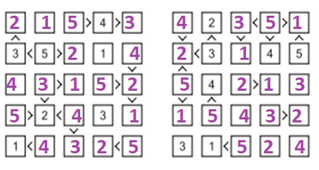 Zad. 2. Rozwiąż sudoku-nierówności. Wpisz do diagramu cyfry od 1 do 5 tak, aby w każdym wierszu i w każdej kolumnie występowały różne cyfry. Znak nierówności między dwiema kratkami wskazuje, która z liczb w tych kratkach jest większa lub mniejsza od drugiej. W rozwiązaniu podaj 1, 3 i 5 wiersz z każdej łamigłówki.