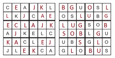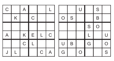 Zad. 1. Rozwiąż sudoku-słowa. W puste kratki wpisz litery użyte w diagramach tak, aby w każdym wierszu, w każdej kolumnie i w każdym pogrubionym prostokącie znajdowało się sześć różnych liter. W rozwiązaniu podaj słowa ukryte w diagramach oraz zawartość a) pustej linii, b) pustego prostokąta.