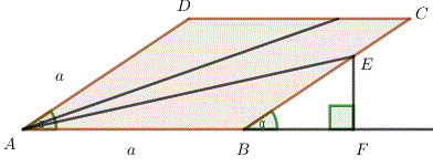 Zad. 3. Z symetrii figury oba odcinki mają tę samą długość. Niech P oznacza pole rombu ABCD, który składa się z dwóch trójkątów równobocznych. Wówczas P = 1/2a2√3, czyli PΔABE = 1/6a2√3. Z drugiej strony PΔABE = 1/2a|BE|sin(180°–α) = 1/2a|BE|sinα = 1/4a|BE|√3 . Zatem 1/6 a2√3 = 1/4a|BE|√3. Stąd |BE| = 2/3a = 4. Z trójkąta ekierkowego BEF wyznaczamy |BF| = 1/2|BE| = 2 oraz |EF| = 4√3/2 = 2√3. Na podstawie twierdzenia Pitagorasa dla trójkąta AEF wyznaczamy |AE|2 = (6+2)2 + (2√3)2 = 64+12 = 76, skąd |AE| = 2√19.