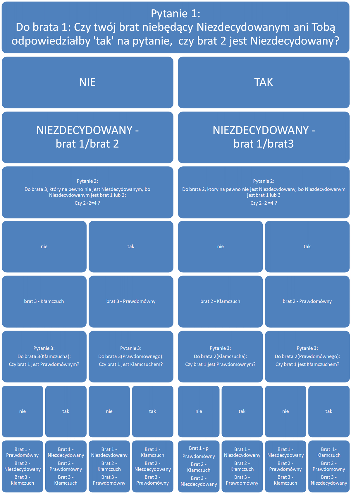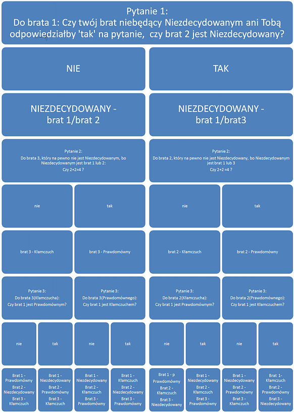 Zad. 2. Trzech braci: Prawdomówny, Kłamczuch i Niezdecydowany odpowiadają na pytania TAK lub NIE. Prawdomówny zawsze mówi prawdę, Kłamczuch zawsze kłamie, a Niezdecydowany czasem mówi prawdę, a czasem kłamie (i niekoniecznie robi to naprzemiennie). Jak za pomocą trzech pytań określić, który z braci to który? Każde pytanie może być skierowane tylko do jednego z braci.