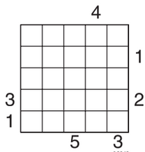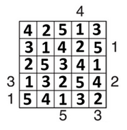 Zad. 1. W każdym wierszu i w każdej kolumnie diagramu należy rozmieścić wieże o wysokościach od 1 do 5, wpisując w każde pole liczbę oznaczającą wysokość wieży, która na nim stoi. Liczba stojąca w obramowaniu diagramu informuje, ile widać wież zmiejsca, gdzie ta liczba stoi. Oczywiście wyższe wieże zasłaniają niższe. W rozwiązaniu należy przysłać wpisane liczby podane kolejnymi wierszami.