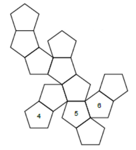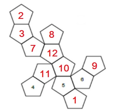 Zad. 3. Kostka w kształcie 12-ścianu foremnego ma na ścianach rozmieszczone liczby od 1 do 12. Suma liczb leżących na przeciwległych ścianach wynosi 13. Wpisz odpowiednie liczby na poszczególnych polach siatki tego 12-ścianu. Zadanie wykonaj bez korzystania z pomocniczej siatki wielościanu.