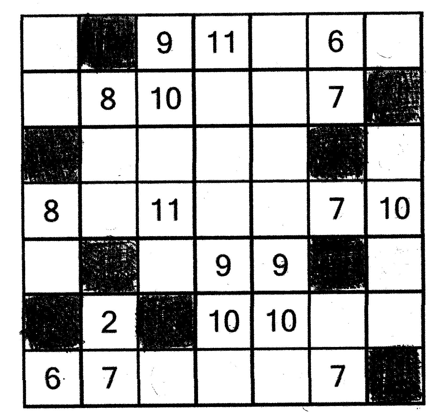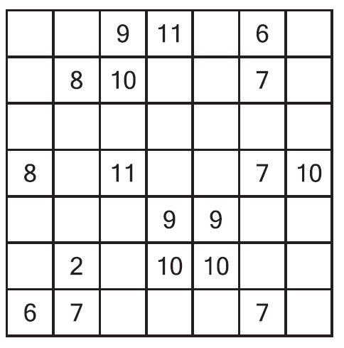 Zad. 3. Każda liczba w diagramie oznacza, ile z tego pola można zobaczyć białych pól, patrząc pionowo i poziomo (licząc razem z polem z tą liczbą). Widoczność ograniczają wieże (zamalowane pola). Ustaw wieże na polach niezawierających numerów (tzn. zamaluj te pola). Wieże nie mogą stykać się bokami, a wszystkie pozostałe na końcu białe pola muszą tworzyć spójną całość przez połączenia bokami. W rozwiązaniu podaj pierwszy, trzeci i ostatni wiersz tabeli, oznaczając przez B - pole białe, C- pole zamalowane.