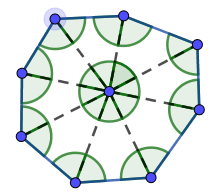 Zad. 3. Suma kątów wewnętrznych ośmiokąta wypukłego wynosi 8·180° – 360° = 1080° (ten sposób obliczeń wyjaśnia rysunek poniżej).