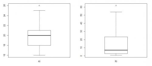 b) min = 0,6; q1 = 2,8; q2 = 7; q3 = 23,4; max = 61,8