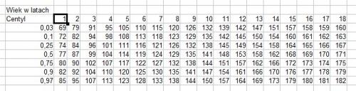 Najwygodniej będzie umieścić dane o wzroście poszczególnych roczników w kolejnych kolumnach. Należy zwrócić uwagę, że nie jest konieczne, aby dzieci w każdym wieku było tyle samo. Następnie pod każdą kolumną obliczamy odpowiednie centyle. Wygodnie będzie, jeśli powyżej obliczonych centyli umieścimy wiersz z liczbą lat, której te centyle odpowiadają, a po lewej stronie umieścimy podpisy centyli. Tabela z obliczonymi centylami może wyglądać np. tak:
