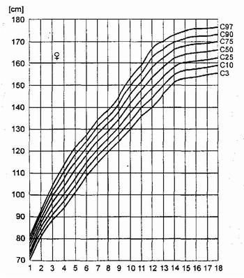 W celu monitorowania wzrostu i wagi dzieci wykonuje się wykresy, które nazywamy siatkami centylowymi. Taką przykładową siatkę centylową dla wzrostu dziewcząt widzimy poniżej: