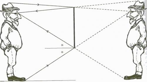 Zad. 3. Pan Janusz powinien kupić lustro o wysokości 90 cm i zawiesić je tak, aby wysokość górnej krawędzi nad podłogą była równa wysokości jego oczu nad podłogą powiększonej o połowę odległości oczu od czubka głowy. Wynika to z równości kątów padania i odbicia (patrz rysunek).