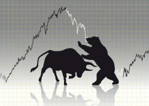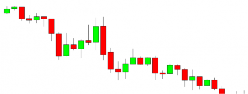 Zad. 3. Wykresy świecowe (przykłady poniżej) stosowane są w analizie statystycznej cen papierów wartościowych lub towarów notowanych na giełdzie. Długotrwały trend wzrostowy tych cen (hossa) nazywany jest rynkiem byka (atakujący byk uderza rogami z dołu do góry), a długotrwały trend spadkowy cen (bessa) nazywany jest rynkiem niedźwiedzia (atakujący niedźwiedź uderza łapą z góry na dół).