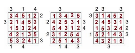 Zad. 1. Na każdej planszy ustaw piramidy o wysokościach od 1 do 5 (wpisując w pole liczbę oznaczającą wysokość piramidy, która na nim stoi) tak, aby w każdym wierszu i kolumnie stały piramidy różnych wysokości. Liczby na obrzeżach diagramów oznaczają, ile piramid widać w danym rzędzie, patrząc z miejsca z liczbą. Oczywiście wyższe piramidy zasłaniają niższe. W odpowiedzi podaj ustawienia piramid w środkowym wierszu (czytając od lewej) i w środkowej kolumnie (czytając od góry).