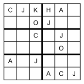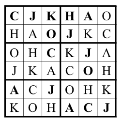 Zad. 3. Rozwiąż walentynkowe sudoku 6×6. W puste kratki wpisz użyte w diagramie litery tak, aby w każdym wierszu, kolumnie i pogrubionym prostokącie znajdowały się różne litery. W rozwiązaniu podaj ukryte w diagramie słowo oraz jego permutacje znajdujące się w II, III, IV i V wierszu.