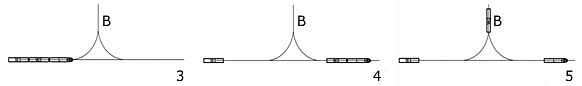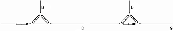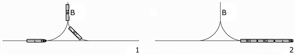 Cofając, lokomotywa przesuwa wagony na lewą stronę (rys. 3). Wagony rozłączamy i lokomotywa przesuwa W2 na prawą stronę, pozostawiając W1 po lewej (rys. 4). Lokomotywa przepycha W2 na bocznicę i wraca na prawo (rys. 5).