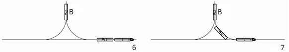 Lokomotywa jedzie po W1 i przeciąga go na prawą stronę (rys. 6), a następnie przepycha na stare miejsce W2 (rys. 7).