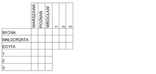 Zad. 3. Najwygodniejszym sposobem rozwiązania zadanie jest wypełnienie poniższego diagramu znakami + i - zgodnie z treścia zadania. W wyniku tego otrzymamy informację, ze Iwona organizuje konkurs po raz drugi w Warszawie, Małgorzata po raz trzeci we Wrocławiu, a Edyta po raz pierwszy w Poznaniu (co jest zreszta zgodne z prawdą).