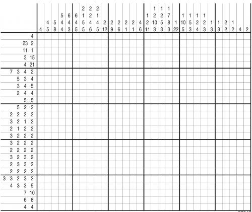 - liczby w wierszach i kolumnach informują o tym, jakie grupy pól są w danym rzędzie zamalowane i w jakiej kolejności, między dwoma grupami zamalowanych pól musi być co najmniej jedna kratka niezamalowana.