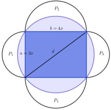 Zad. 3. W koło o promieniu 20 cm wpisano prostokąt, w którym stosunek długości boków wynosił 3:4. Następnie na zewnątrz prostokąta narysowano półokręgi, których średnicami były kolejne boki prostokąta. Pola obszarów ograniczonych łukami tych półokręgów i łukiem okręgu opisanego na prostokącie oznaczono odpowiednio P1, P2, P3, P4. Oblicz sumę pól tych obszarów. Takie obszary nazywamy księżycami Hipokratesa wielokąta wpisanego w okrąg.