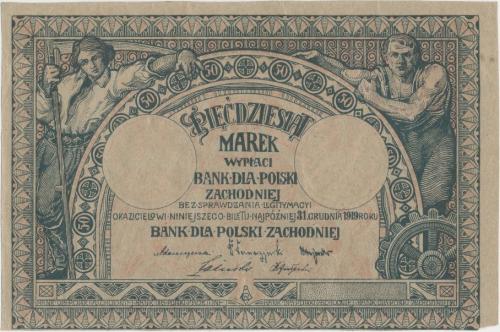 W grudniu 1918 po zwycięstwie Powstania Wielkopolskiego Naczelna Rada Ludowa w związku z dużymi różnicami gospodarczymi między Poznańskiem a Królestwem Polskim i Galicją postanowiła zachować do końca 1919 roku granicę celną między zaborami i emitować własną walutę o nazwie marka poznańska. W tym celu ogłoszono stworzenie Banku dla Polski Zachodniej (późniejszy Bank Zachodni) jako banku emisyjnego. Warszawa to oprotestowała i ostatecznie w całym kraju wprowadzono markę polską. Cały nakład banknotów marek poznańskich był gotowy, ale spłonęły one podczas II wojny światowej. Tam podobno były takie właśnie postaci jak baba z grabiami i chłop z kosą. Do dziś zachowały się z tej emisji jedynie 3 banknoty 50-markowe.