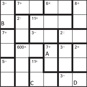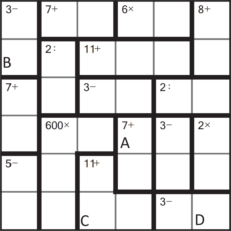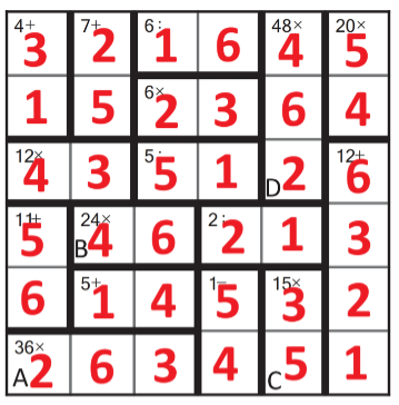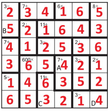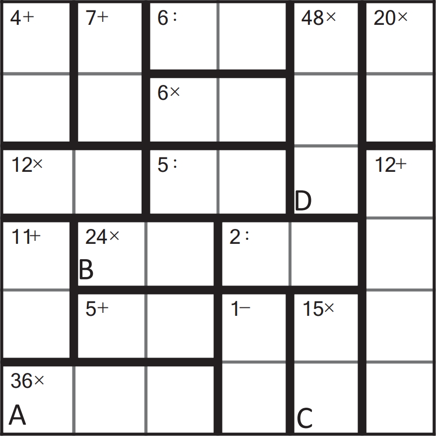 Zad. 2. Rozwiąż sudoku-działania. W odpowiedziach podaj zawartość pól A, B, C, D. Jak w klasycznym sudoku, wszystkie cyfry od 1 do 6 powinny występować raz w każdym wierszu i kolumnie, ale w pogrubionych obszarach mogą się powtarzać. W pola pogrubionego obszaru należy wpisać liczby, które pozwolą uzyskać podany w tym obszarze wynik za pomocą podanego działania (np. w obszar opisany jako "2:" można wpisać w dowolnych pozycjach 2 i 1 lub 4 i 2). Podwójne kliknięcie otwiera diagramy w nowym oknie.