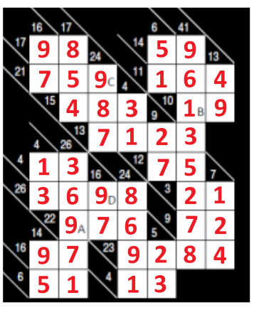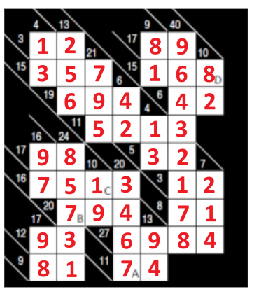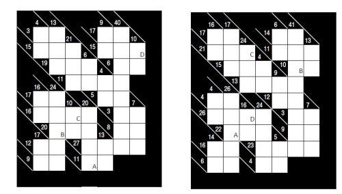 Zad. 3. Rozwiąż kakuro - krzyżówki liczbowe. W odpowiedziach podaj zawartość pól A, B, C, D. W puste kratki wpisz cyfry od 1 do 9, tak aby zgadzały się sumy poziome i pionowe. W obrębie jednej liczby wpisanej do krzyżówki cyfry nie mogą się powtarzać.