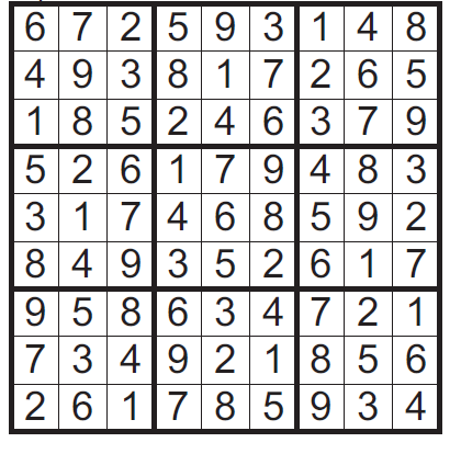 Zad. 1. Rozwiąż sudoku. W odpowiedzi podaj zawartość 1, 4, i 7 wiersza oraz 3, 6 i 9 kolumny.