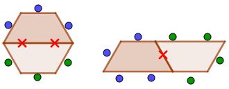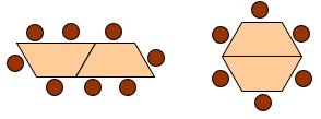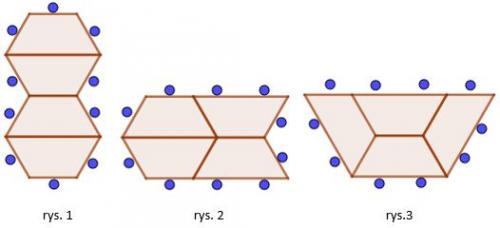 Zad. 1. W klasie znajdują się ławki w kształcie trapezu równoramiennego będącego połową sześciokąta foremnego. Przy każdym z krótszych boków może usiąść jedna osoba, a przy dłuższym - dwie. Dwie ławki można zestawić, tworząc miejsca dla 6 lub 8 osób, jak na rysunku.