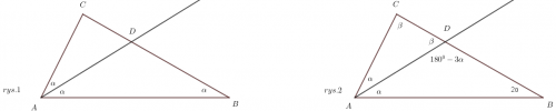 A) Jeśli odcięty trójkąt ABD jest równoramienny (rys. 1 poniżej), to ponieważ trójkąt ABC był równoramienny, zachodzi |∡BCA| = 2α lub |∡BCA| = α (dlaczego tylko te przypadki są możliwe?). Stąd otrzymujemy α = 36° lub α = 45°, co daje możliwe trójkąty o kątach (36°, 72°, 72°) albo (45°, 45°, 90°).
