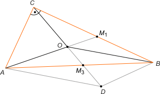 Zad. 1. Łatwo wykazać, że punkt O jest środkiem ciężkości trójkąta. Przedłużmy środkową CM3 tak, żeby |OM3| = |M3D|. Otrzymujemy równoległobok ADBO. Zauważmy, że |AB| = 2|CM3|, bo środkowa przeciwprostokątnej jest od niej dwa razy krótsza, oraz |OD| = |CO|, bo z własności środka ciężkości |OM3|=|CO|/2. Wystarczy teraz wykorzystać zależność między przekątnymi i bokami w równoległoboku: suma kwadratów długości przekątnych jest równa sumie kwadratów długości boków. Przyjmując |AO| = p oraz |OB| = q, otrzymujemy |CO|=|OD| = [tex]\frac{\sqrt{p^2+q^2}}{5}[/tex]. W pozostałych przypadkach otrzymujemy odległości [tex]\sqrt{5p^2-q^2}[/tex] oraz [tex]\sqrt{5q^2-p^2}[/tex].