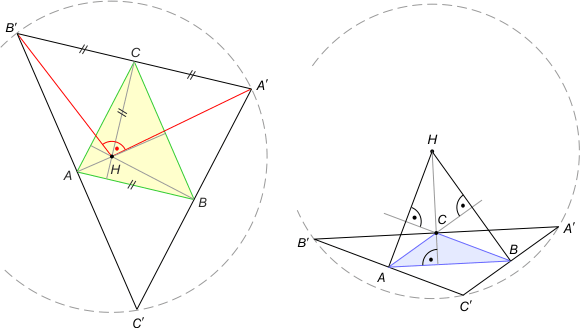 Zad. 2. Niech ABC będzie trójkątem ostrokątnym. Przez jego wierzchołki prowadzimy proste równoległe do boków, otrzymując trójkąt A'B'C' podobny do wyjściowego w skali 2:1 (cecha kkk). Zauważmy, że punkt H jest środkiem okręgu opisanego na trójkącie A'B'C' (jako punkt przecięcia symetralnych boków tego trójkąta). Wobec założenia |AB| = |CA'| = |CB'| = |CH| mamy |∡B'HA'| =90°. Wówczas kąt wpisany B'C'A' ma miarę 45°, zatem |∡ACB| = 45°. Rozumując analogicznie w przypadku trójkąta rozwartokątnego (|∡ C|>90°), otrzymujemy |∡ACB| = |∡B'C'A'| = 135°. Gdy kąt B jest rozwarty, otrzymujemy |∡C| = 45°. Zauważmy, że wszystko zależy od tego, czy punkty H i C leżą po jednej czy po obu stronach prostej A'B'.