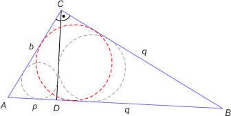 Zad. 3. W trójkącie prostokątnym wysokość dzieli przeciwprostokątną na odcinki o długościach p i q. Ile wynosi suma długości promieni okręgów wpisanych we wszystkie trójkąty?
