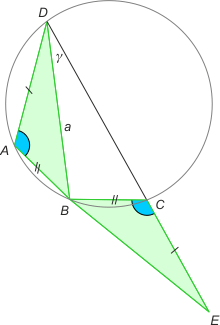 Zad. 4. (wolna amerykanka) Czworokąt ABCD jest wpisany w okrąg. Jakie ma pole, jeśli |AB| = |BC|, |BD| = a oraz |∡CDB| = γ?