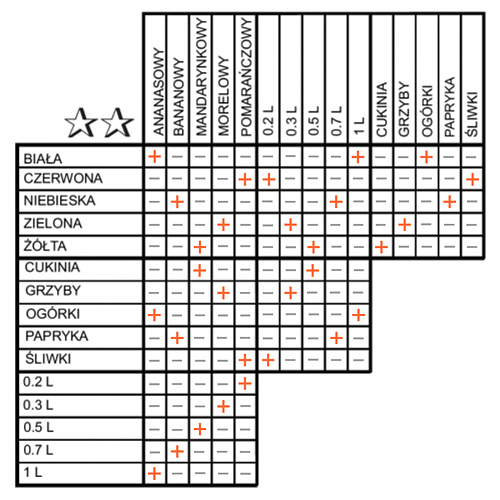 Pan Zdzisław postanowił usmażyć dżemy z owoców, które w dużej ilości pozostały mu po imprezie imieninowej, w tym z ogromnego ananasa. Umieścił je w słoikach po zużytych wcześniej przetworach, w tym w słoiku po korniszonach. Słoiki miały różne pojemności: 0,2 l, 0,3 l, 0,7 l, pół litra i litr, a jeden z nich miał zieloną pokrywkę. Dżem pomarańczowy miał albo czerwoną, albo żółtą pokrywkę. Słoik z dżemem mandarynkowym miał objętość o 0,3 l większą od słoika ze śliwką na etykiecie. Trzy słoiki o kolejnych coraz większych pojemnościach to ten z czerwoną pokrywką, z dżemem morelowym oraz z cukinią na etykiecie. Trzy kolejne słoiki o coraz mniejszych pojemnościach to ten z białą pokrywką, z dżemem bananowym oraz z dżemem mandarynkowym. Albo słoik z cukinią na etykiecie ma białą pokrywkę, albo ten z dżemem bananowym ma niebieską pokrywkę. Słoik z żółtą pokrywką jest większy od tego z grzybami na etykiecie. Słoik z dżemem ananasowym nie ma etykiety z papryką. Który z dżemów lekko trącił octem po korniszonach?