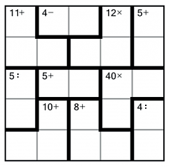 Zad. 1. Diagram poniżej przedstawia kwadrat mozaikowy. W każde jego pole należy wpisać cyfry od 1 do 5, tak żeby wszystkie wystąpiły w każdym wierszu i w każdej kolumnie. Ponadto na liczbach wpisanych w obszarach obwiedzionych grubą linią po wykonaniu wskazanego w danym obszarze działania powinien wyjść wskazany w nim wynik. W odpowiedzi podaj zawartość kolejnych wierszy diagramu.