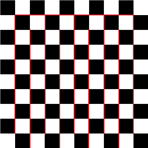 Zad. 3. Ustawiamy na szachownicy nieprzekraczalną barierę, zgodnie z rysunkiem. Rozpoczynamy układanie kostek domina od pola sąsiadującego z usuniętym. Jest to możliwe, gdyż między polami o różnych kolorach znajduje się parzyście wiele pól.