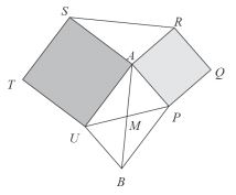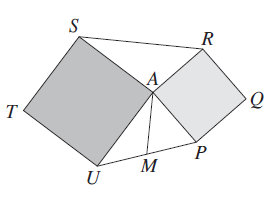 Zad. 2. Kwadraty z rysunku mają wspólny wierzchołek A, a punkt M jest środkiem odcinka PU. Pokaż, że AM jest połową RS.