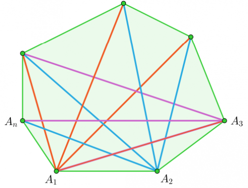 Zad. 3. Niech n oznacza liczbę boków, a p liczbę przekątnych szukanego wielokąta. Zauważmy, że z jednego wierzchołka możemy poprowadzić o 3 przekątne mniej niż wielokąt ma boków (dlaczego?), czyli n–3. Wszystkich wierzchołków jest n, więc jeśli policzymy przekątne poprowadzone ze wszystkich wierzchołków, będzie ich n(n–3). Kazdy z tych odcinków łączy dwa wierzchołki, więc jest liczony dwukrotnie - raz w jednym i raz w drugim wierzchołku, które łączy (np. odcinek A1A3 jest liczony raz w wierzchołku A1 i drugi raz w wierzchołku A3), zatem n(n–3) = 2p (podwojona liczba przekątnych). Z warunków zadania mamy p = 3n, czyli n(n–3) = 6n, a stąd n–3 = 6, więc n = 9. Szukany wielokąt to dziewięciokąt.