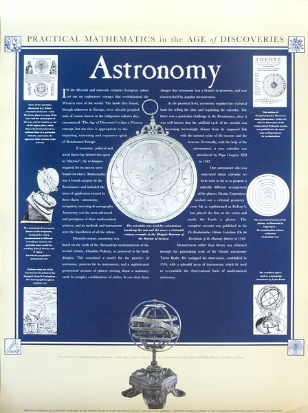 Podstawą nauczania astronomii w XV wieku było dzieło starożytnego matematyka z Aleksandrii z II w. n.e. Klaudiusza Ptolemeusza "Almagest". Zawierało szkice technik dokonywania obserwacji i pomiarów astronomicznych, opisy używanych do tego przyrządów i żmudne obliczenia geometryczne położeń planet, które w systemie ptolemejskim krążyły wokół nieruchomej Ziemi po okręgach. Astronomia była wtedy integralną częścią geometrii związaną głównie z pomiarami kątowymi. Taką tradycyjną geometrię nieba na plakacie reprezentuje XV-wieczna sfera armilarna z Ziemią w centrum, równikiem niebieskim, zwrotnikami, kołami podbiegunowymi oraz ekliptyką z naniesionym zodiakiem. Plakat zawiera też szkice instrumentów używanych przez Ptolemeusza i ilustrację jego systemu kosmologicznego.