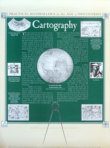 Kreślenie map jest zwieńczeniem działań prezentowanych na poprzednich plakatach. Wymaga wiedzy z astronomii, nawigacji i prowadzenia pomiarów w terenie. Istnieje ścisły związek między położeniem punktów i obszarów na sferze niebieskiej i sferze ziemskiej, zaś rozwój nawigacji sprzyja wzrostowi zapotrzebowania na mapy, a jednocześnie pozwala na ich dokładniejsze kreślenie, dzięki bezpośrednim obserwacjom.
